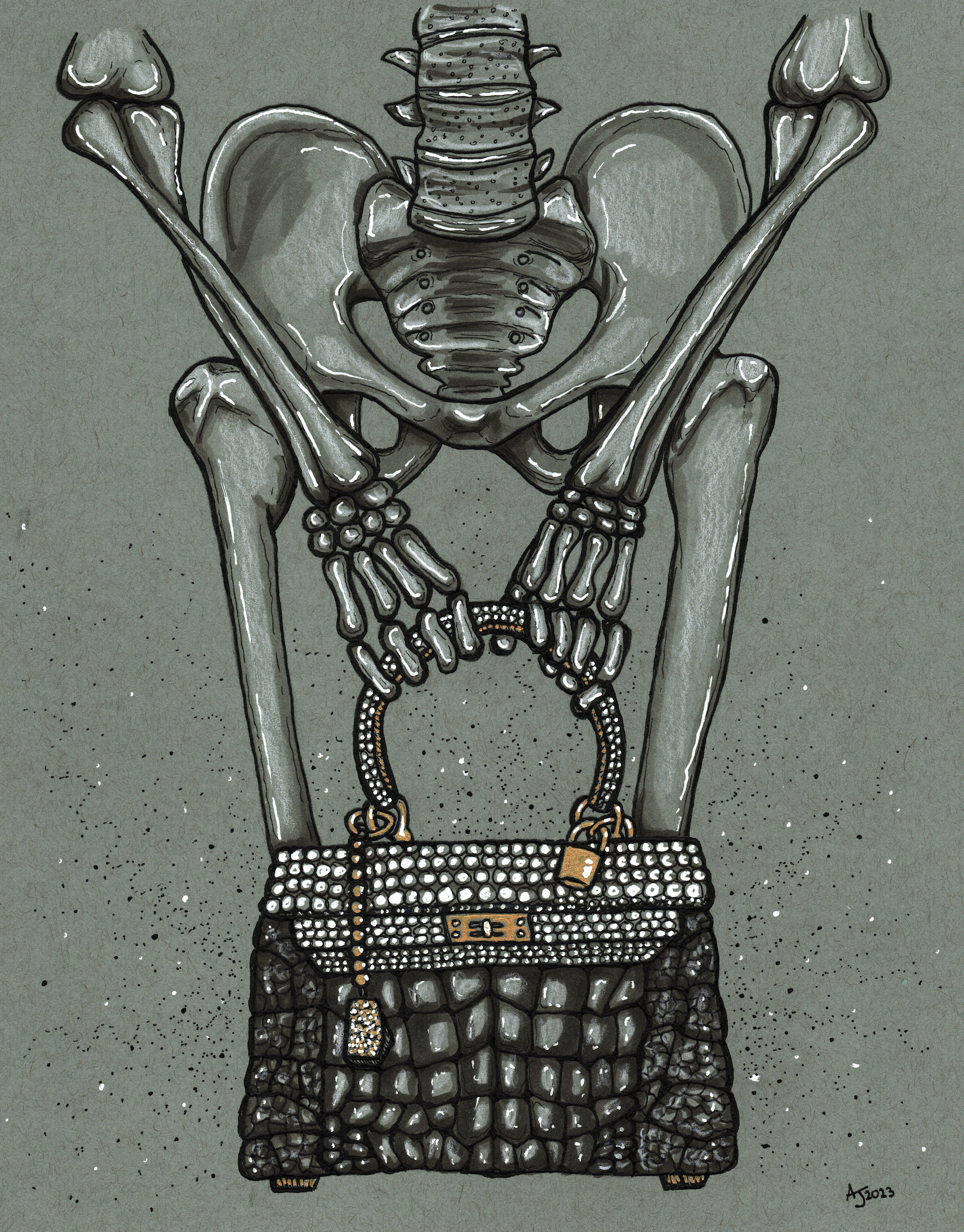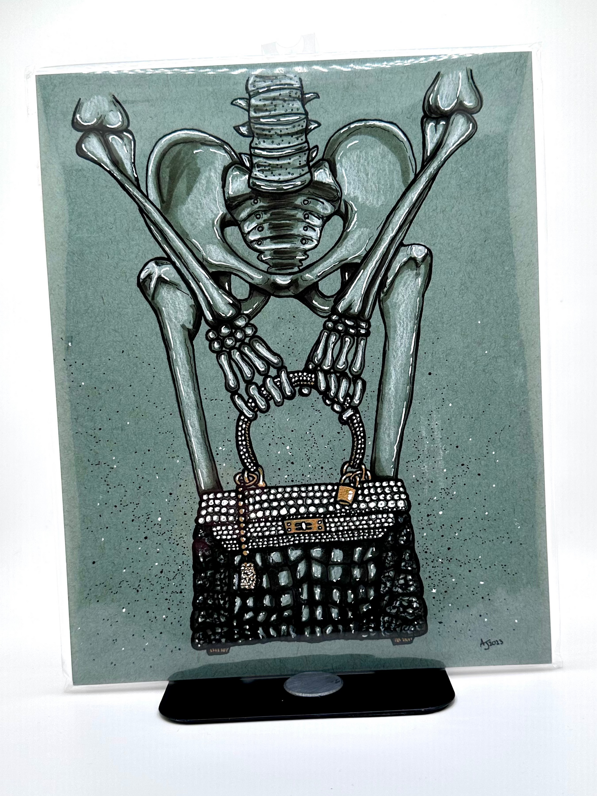 Original ink and gel pen drawing was on 9"x12" blue-toned paper, inspired by the 2023 Inktober prompt of "Fortune." This is 3 of 3 in the Bone Beauty series.